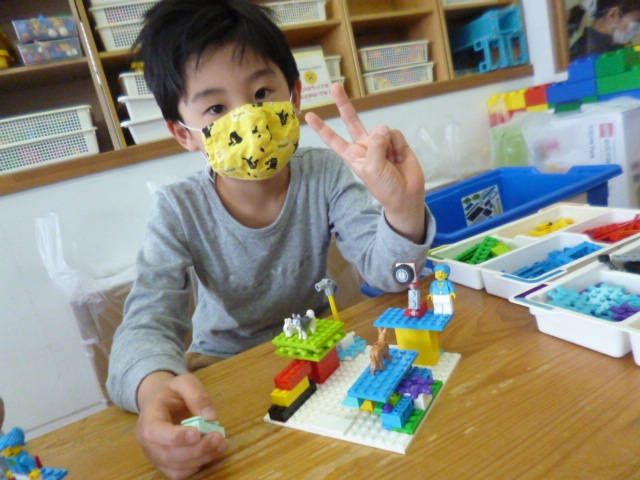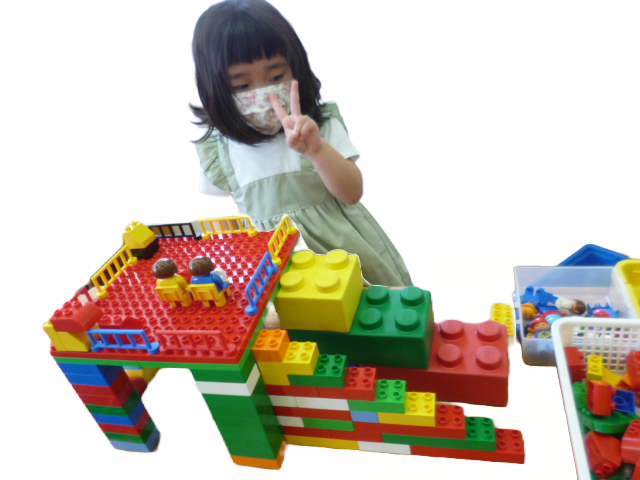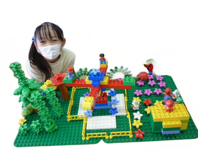 年少さん向けのレッスンでは、自分の手を使ってブロックで組み立てながら、ものの動きを試したり、お話のシーンを表現したりします。