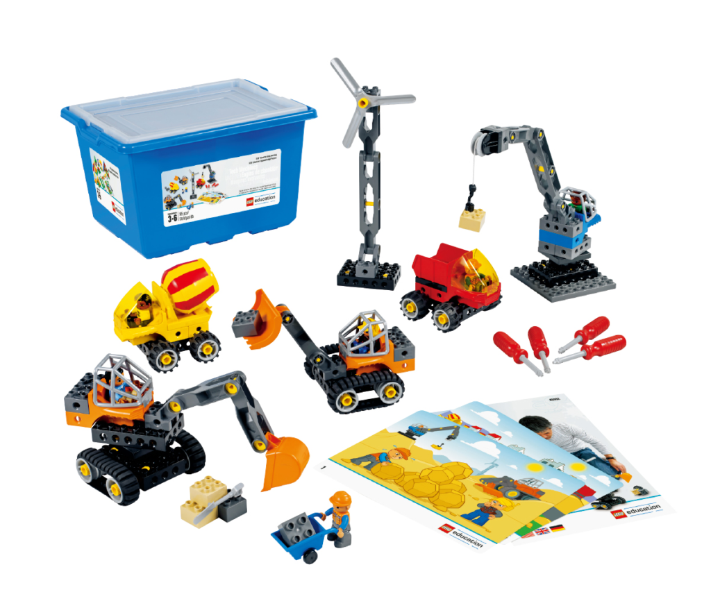 クレーンやショベルカーなど身の回りの乗り物や想像した乗り物を専用ドライバーで組み立てるセットです。